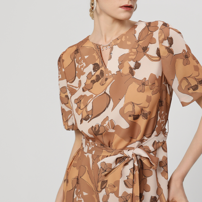 卡其色印花小V领短袖 新品 系带收腰连衣裙 淡人穿搭夏季 阿丹娜女装
