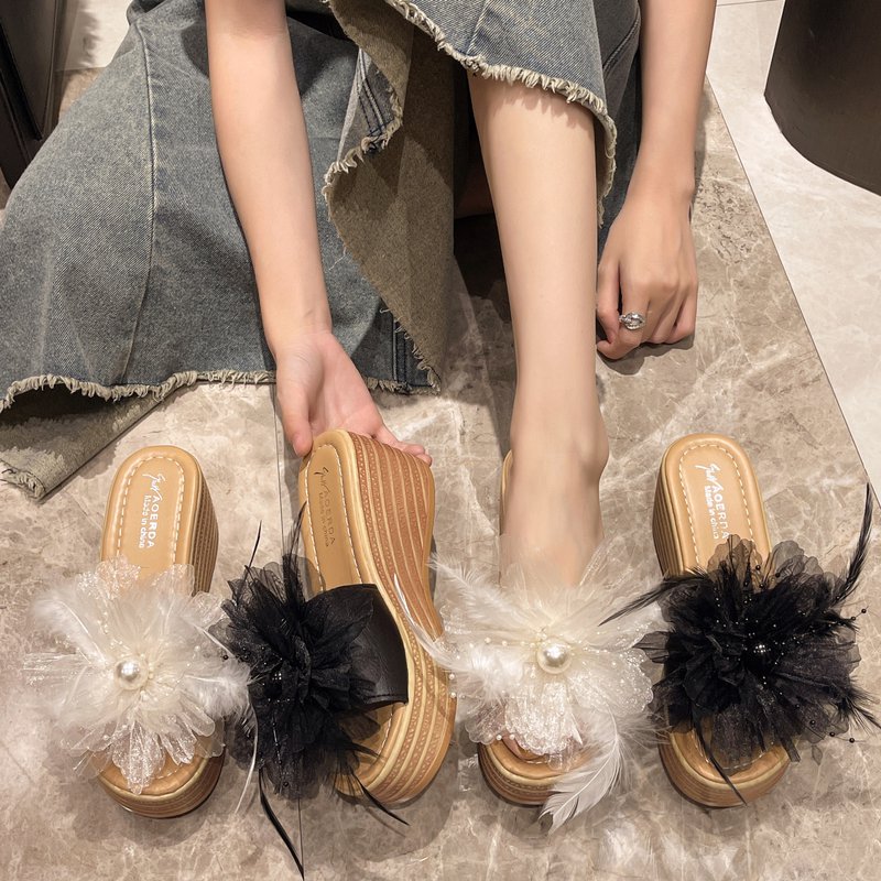 仙气羽毛坡跟凉拖鞋 小个子增高百搭外穿海边度假风一字拖 女夏季