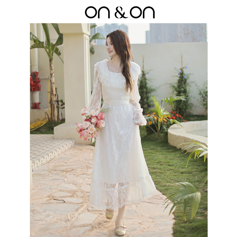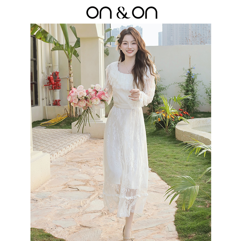 法式 新款 双层蕾丝领系带可露丽气质连衣裙 安乃安2025秋季 ON&ON