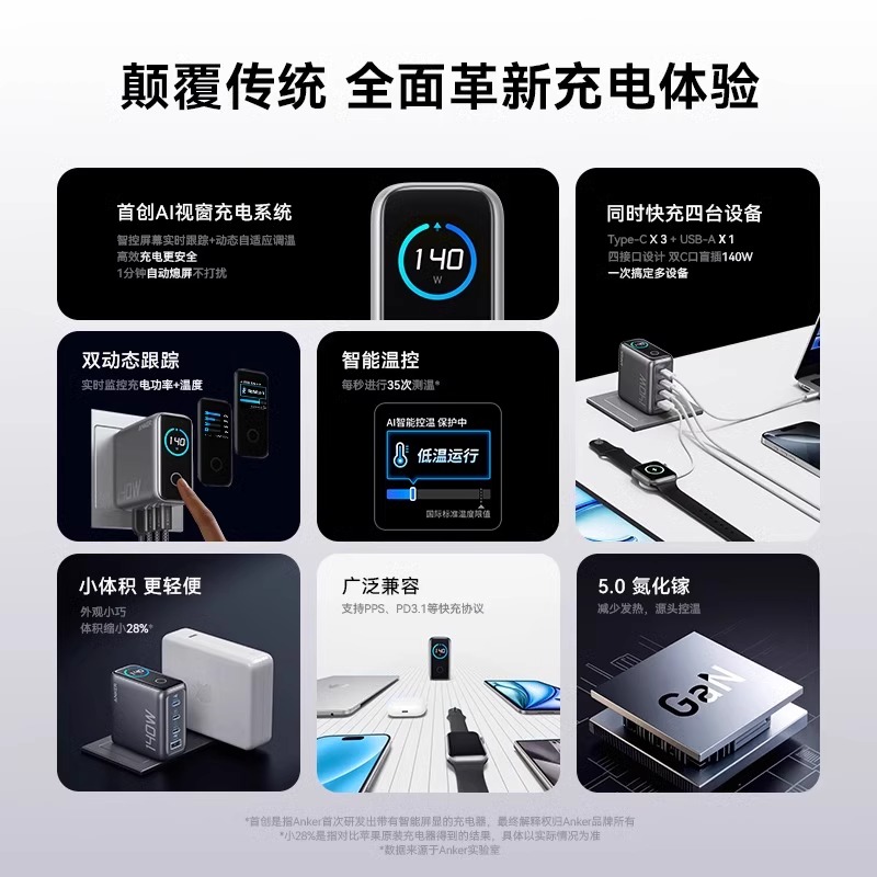 Anker安克140W屏显GaN氮化镓四口充电器数据线适用苹果17充电华为平板电脑笔记本插头充电站 iPhone17上新