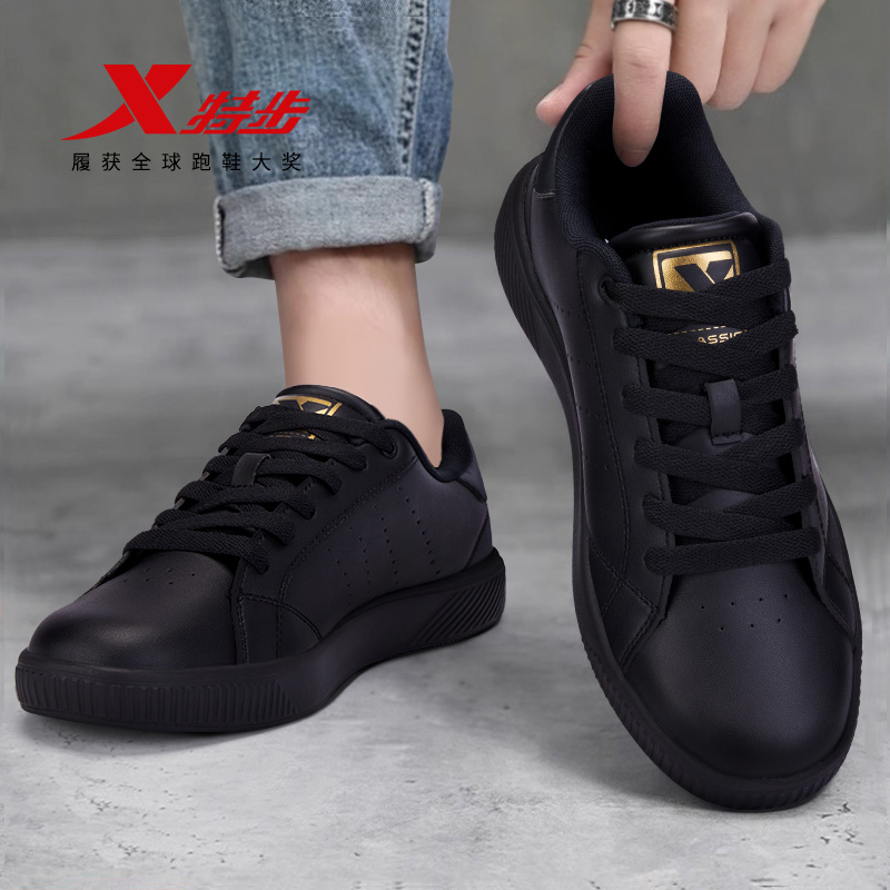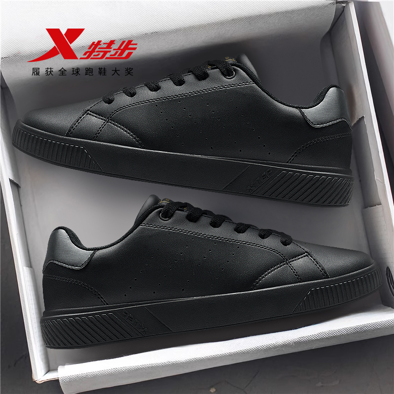 皮面纯黑男女鞋 特步板鞋 情侣百搭休闲运动鞋 黑色板鞋 子 男2025新款
