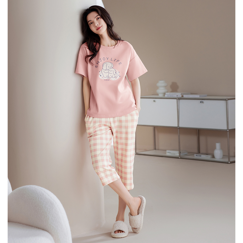 休闲夏天可爱家居服套装 芬腾带胸垫睡衣女纯棉夏季 大码 七分裤 短袖