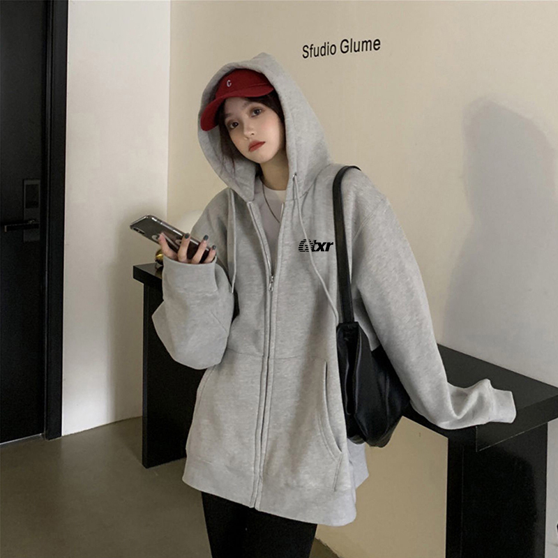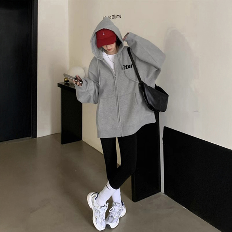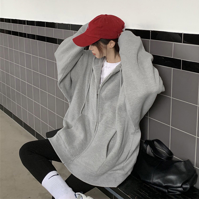 外套显瘦宽松上衣女 加绒连帽开衫 美式 复古oversize卫衣女秋冬大码