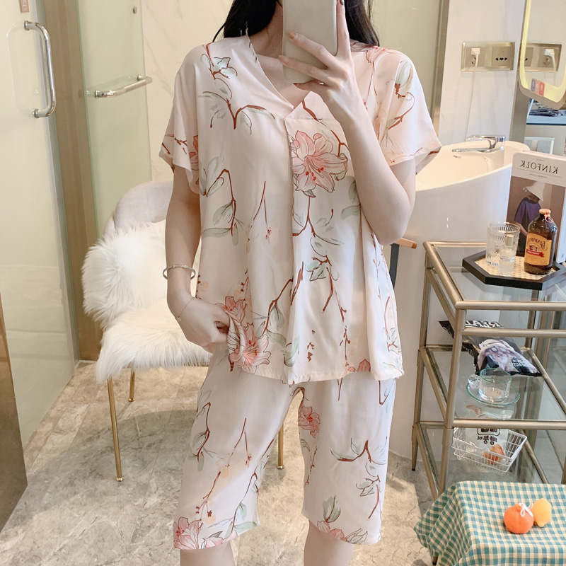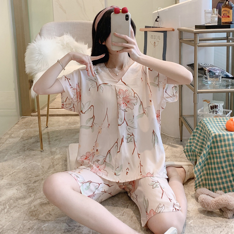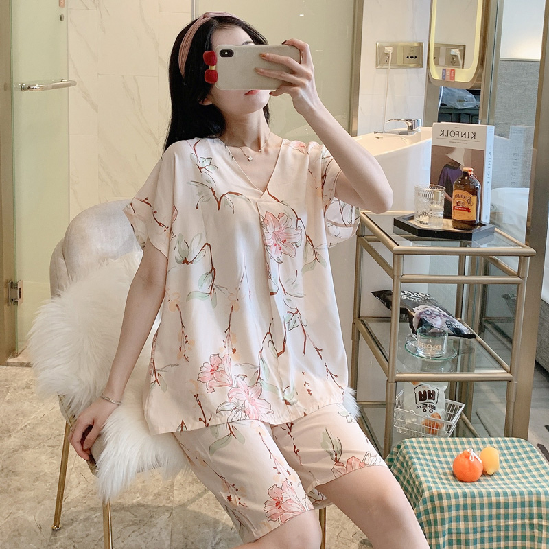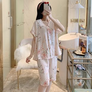 大码 套装 V领套头棉绸睡衣女薄款 短裤 绵绸宽松胖MM家居服 中袖 夏季