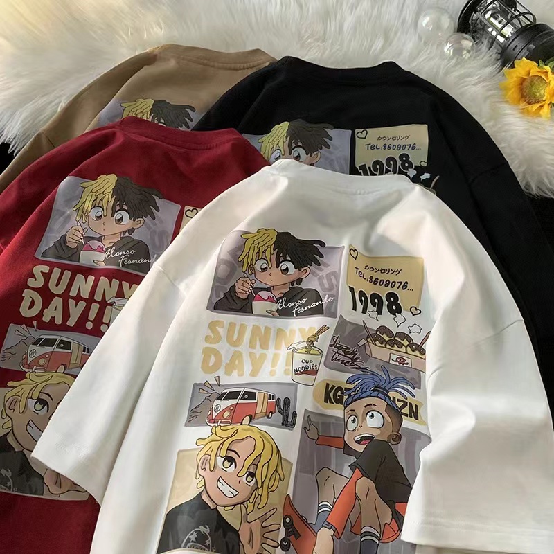 ins潮复古卡通设计感上衣 宽松纯棉短袖 夏季 百搭国潮t恤女胖mm大码