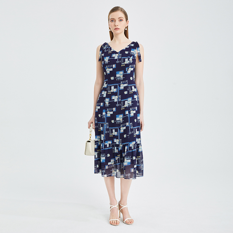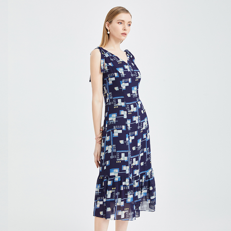 长裙收腰裙子 蓝色V领印花雪纺连衣裙无袖 专柜正品 马天奴夏季