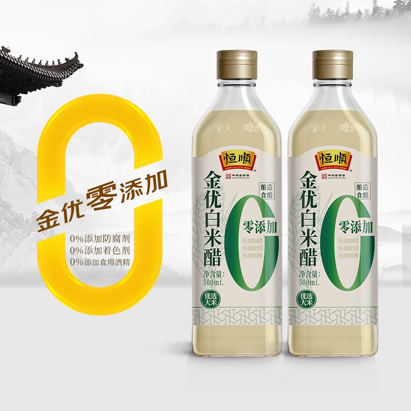 恒顺金优零添加白米醋500ml 2瓶酿造白醋蘸料醋炒菜凉面调料凉拌