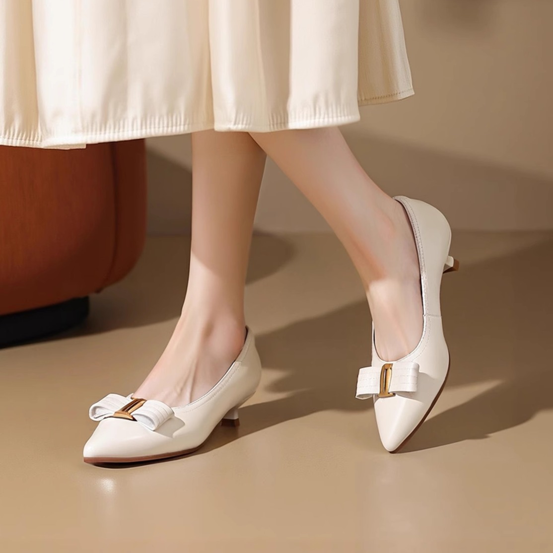 白色细跟低跟蝴蝶结浅口单鞋 女2025春新款 尖头高跟鞋 GNC真皮法式
