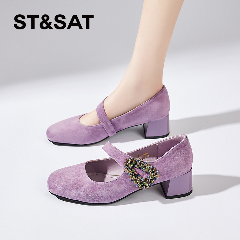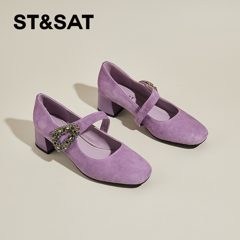 女2025秋季 单鞋 新款 粗跟玛丽珍女鞋 紫色气质法式 星期六羊皮高跟鞋