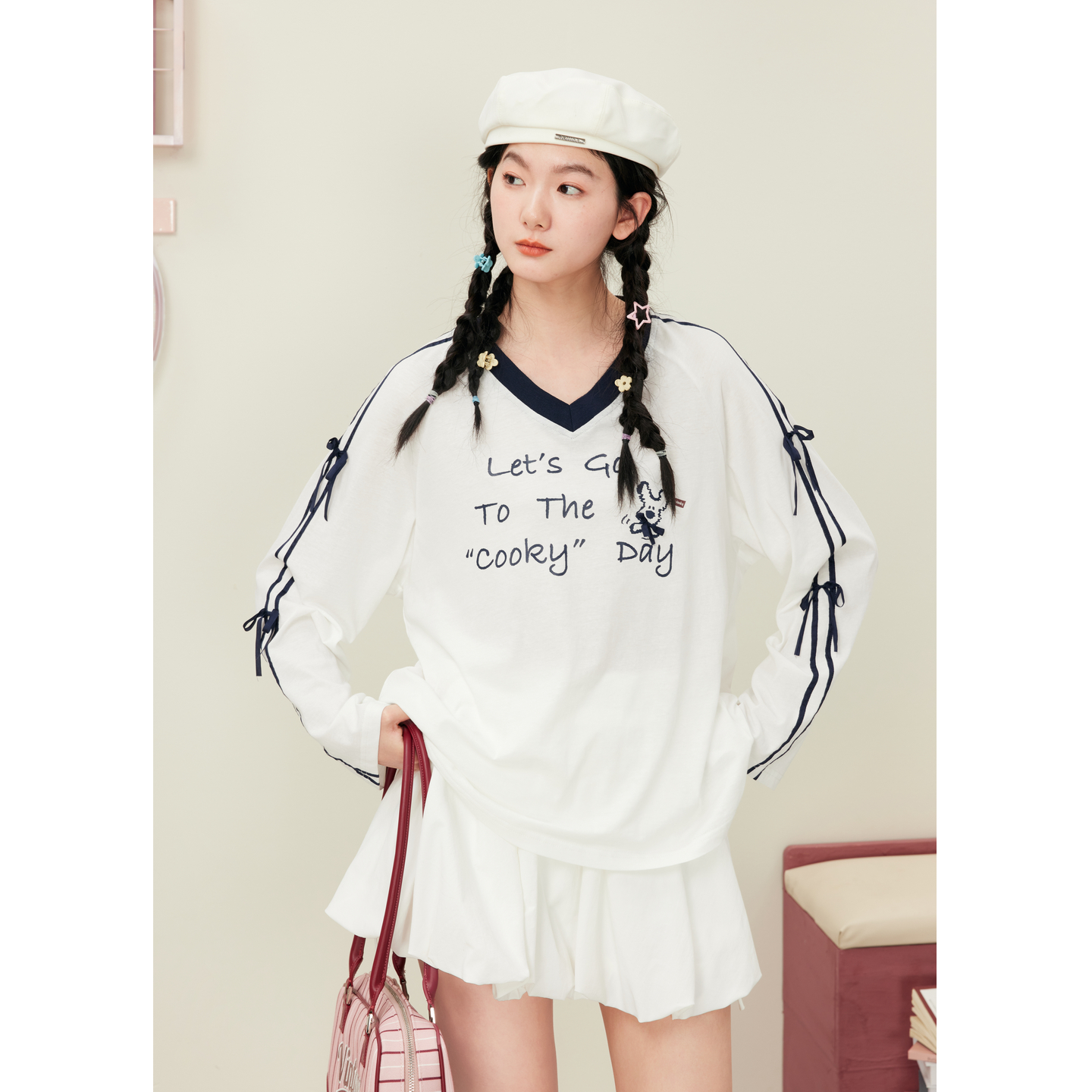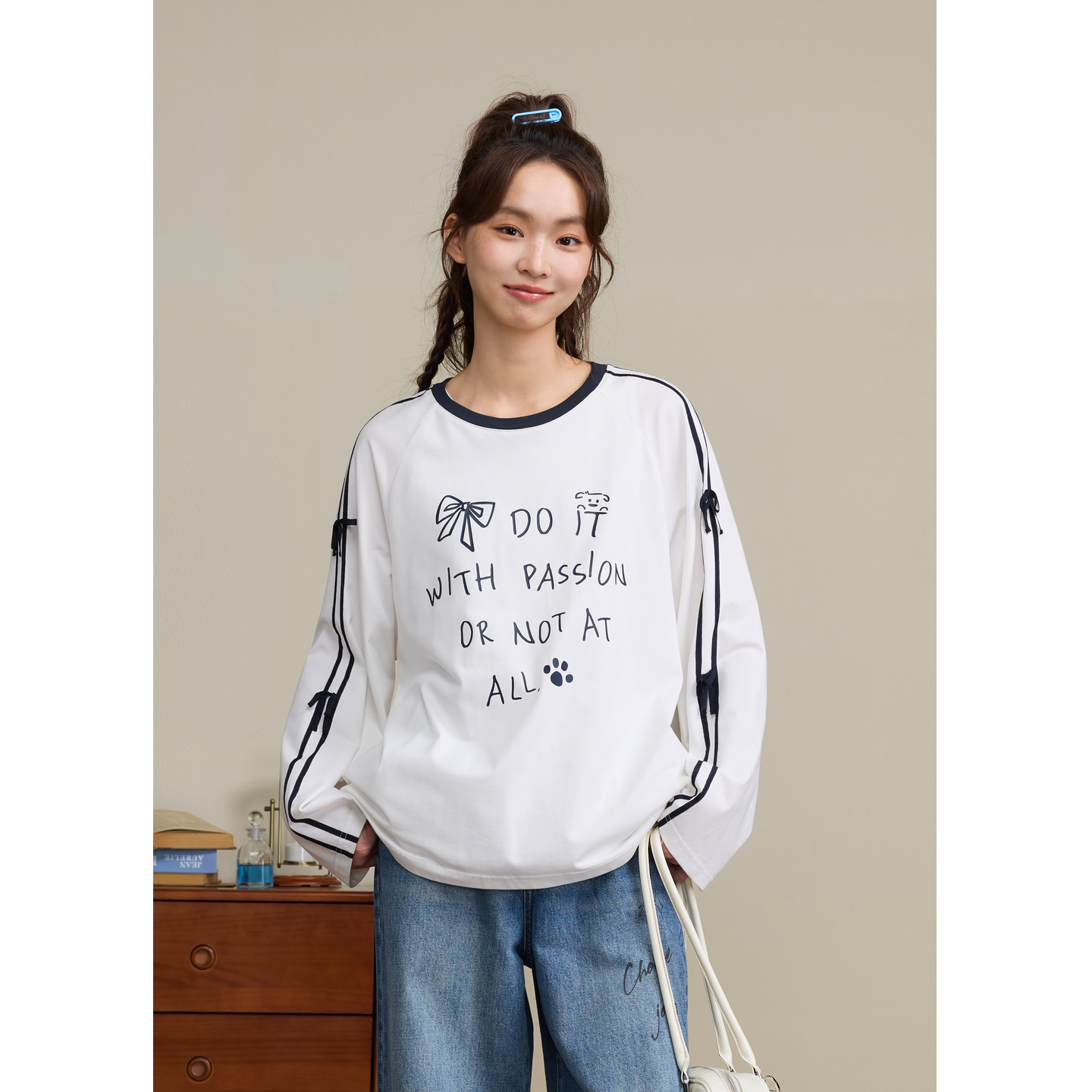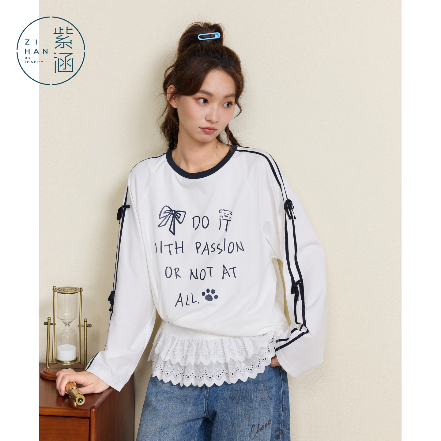 紫涵圆领印花长袖 甜美学院风蝴蝶结宽松白色上衣 T恤2025早秋新款