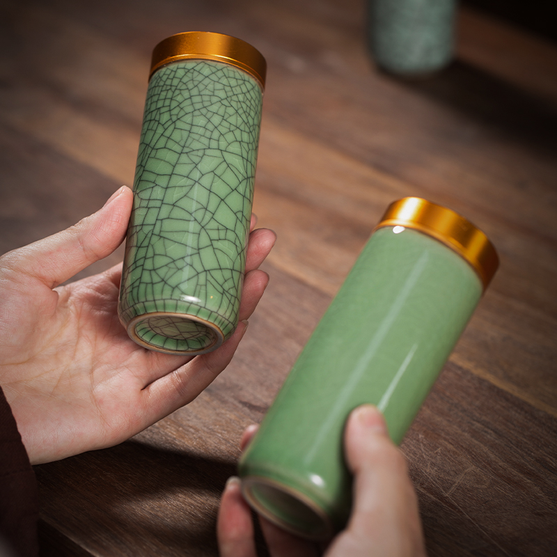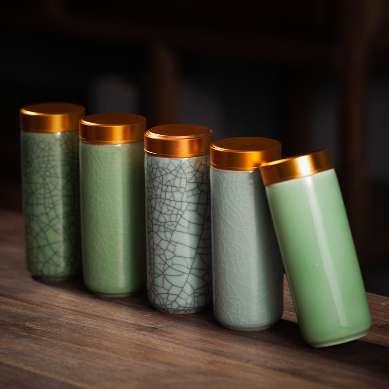 青瓷茶叶罐小号加长款 礼盒 便携迷你金属陶瓷密封罐储茶罐茶叶包装