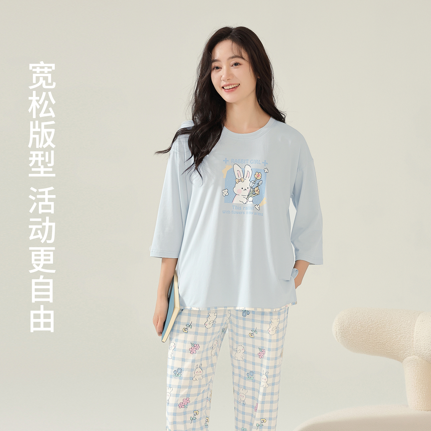 卡通萌兔印花薄长裤 新一步 纯棉七分袖 睡衣女夏季 家居服 7A抗菌