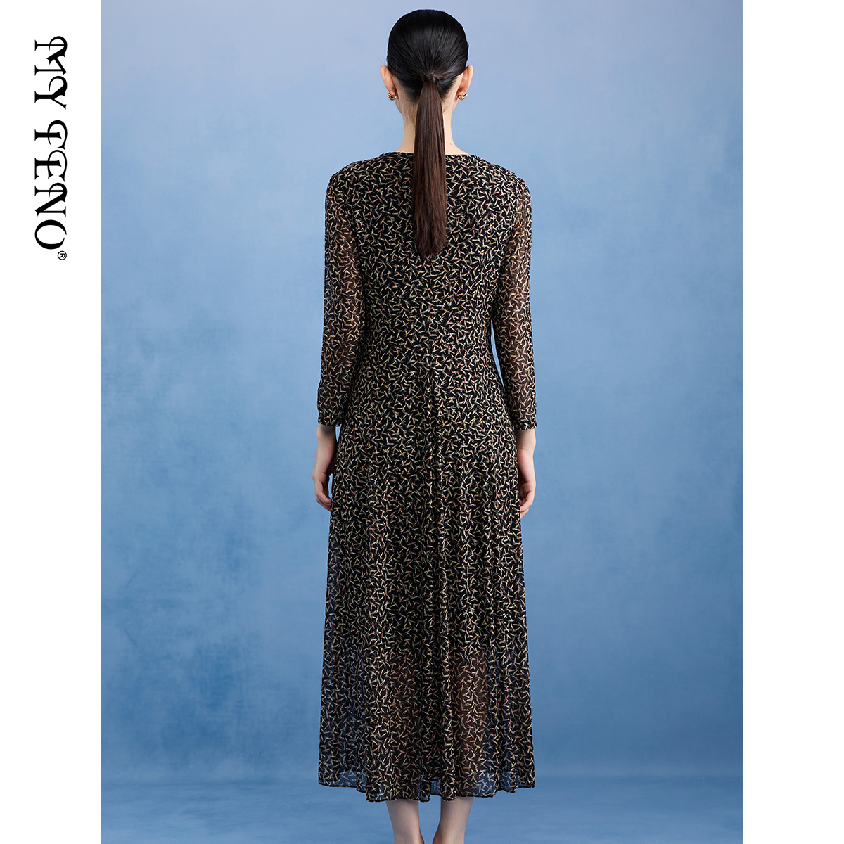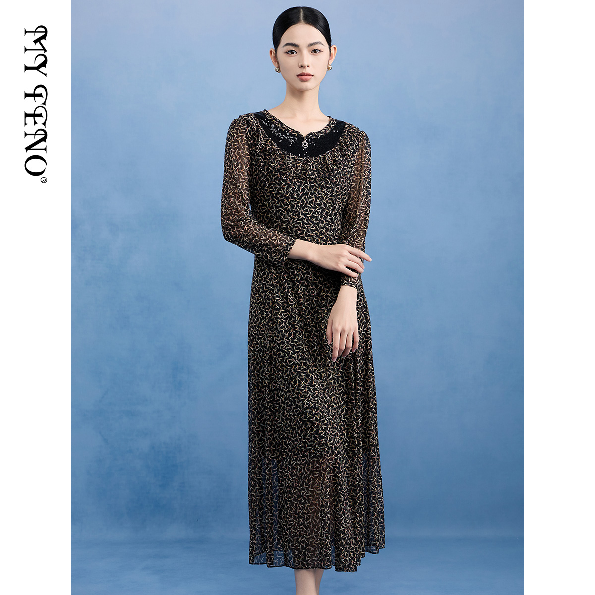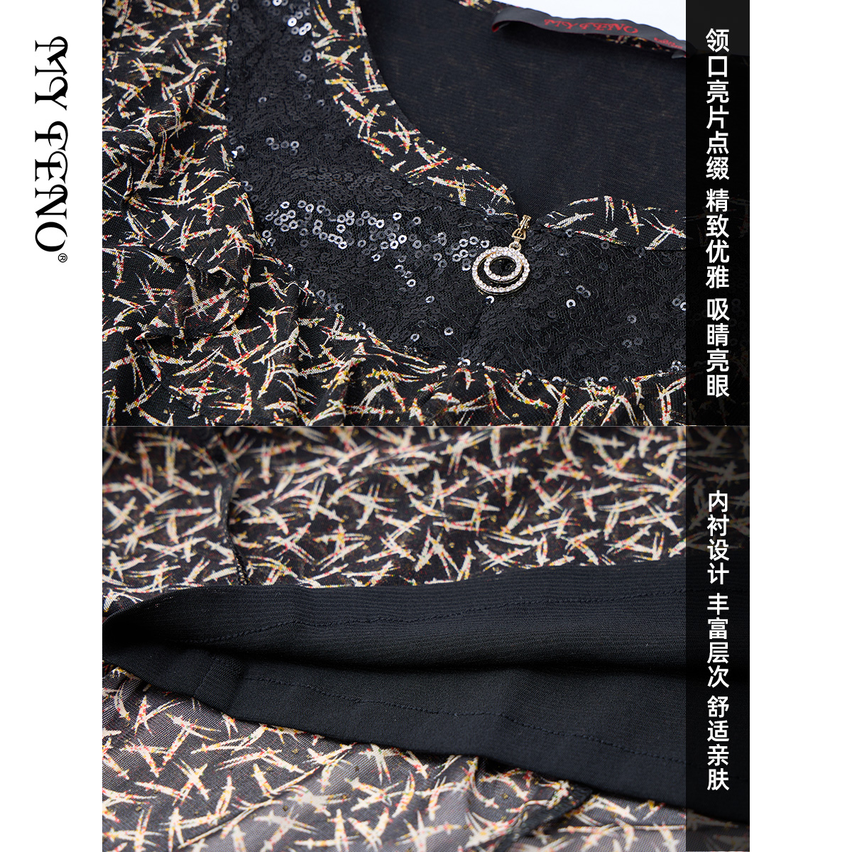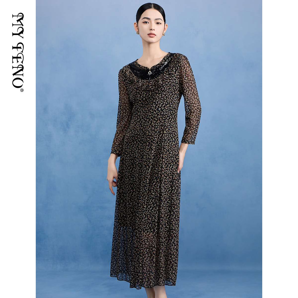 菲梦伊100桑蚕丝连衣裙女喇叭袖 高端品质双绉真丝镶钻长裙子 夏装