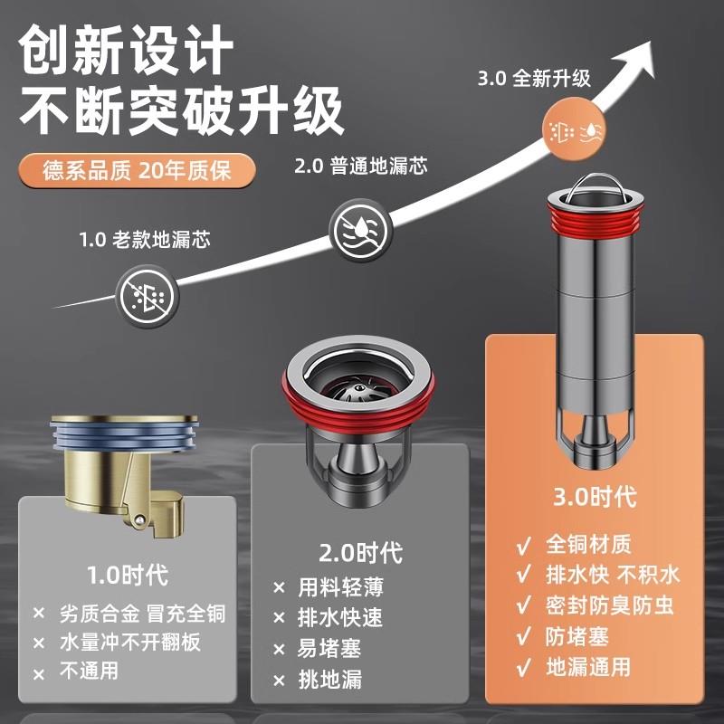 德国2025新款 防臭地漏卫生间通用全铜下水道防返臭神器防溢水加长