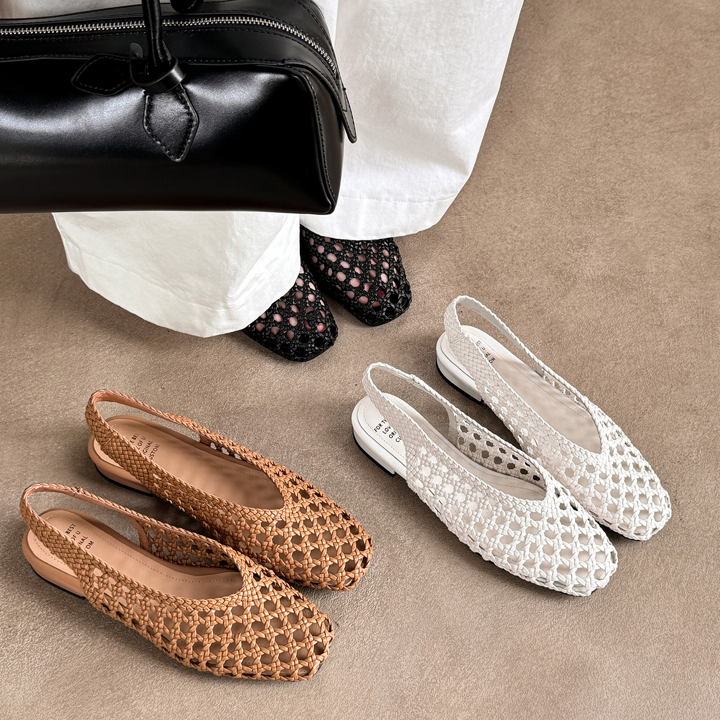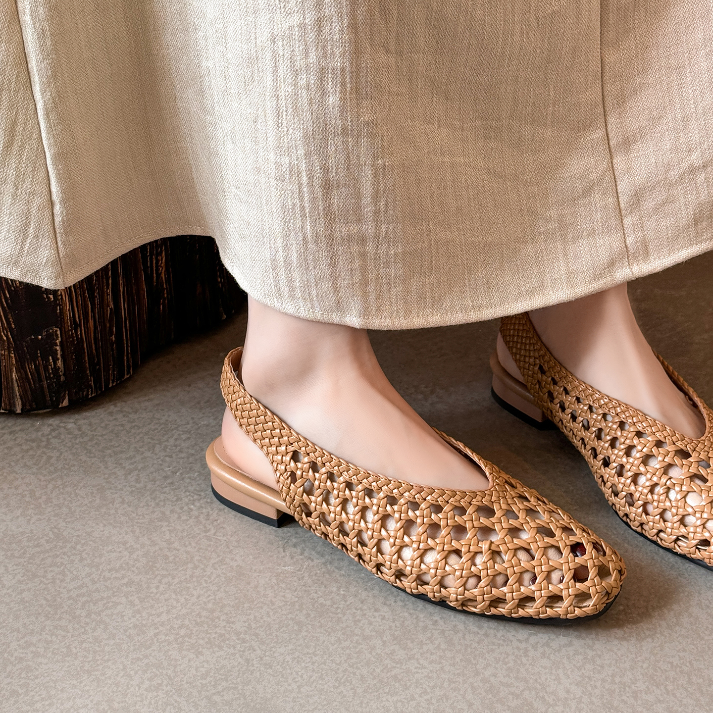 开怀依足上脚惊艳真皮编织纯色度假风方头粗跟一脚蹬包头凉鞋 女鞋