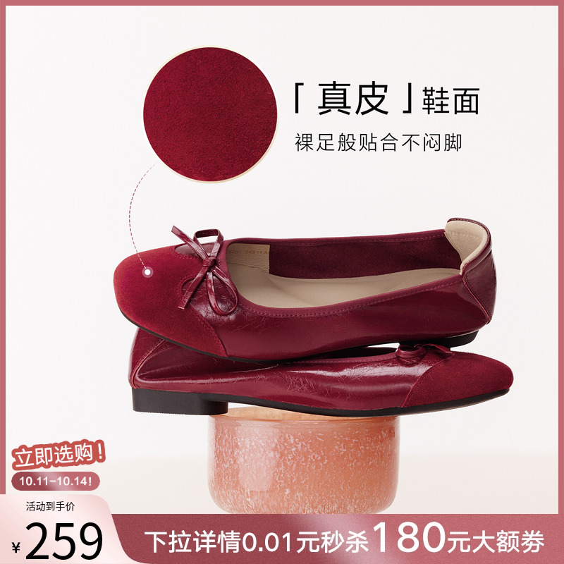 女鞋 百思图2025秋季 蝴蝶结通勤船鞋 牛皮红色浅口单鞋 C2201CQ5 新款