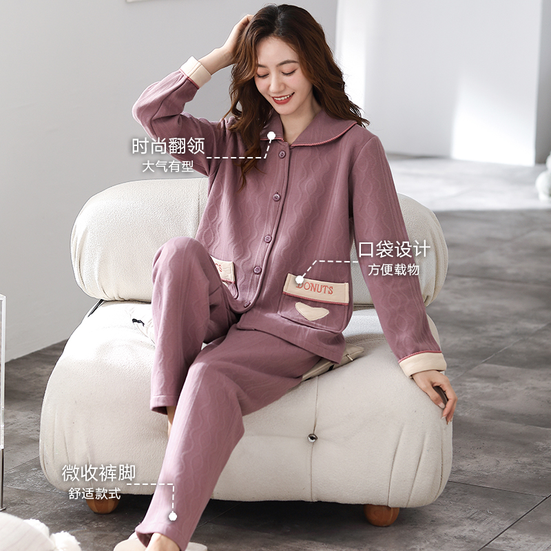 可外穿 妈妈家居服套装 雅鹿中老年睡衣女秋冬款 空气棉夹层加厚长袖