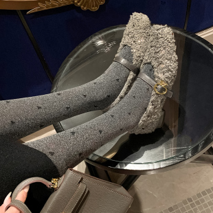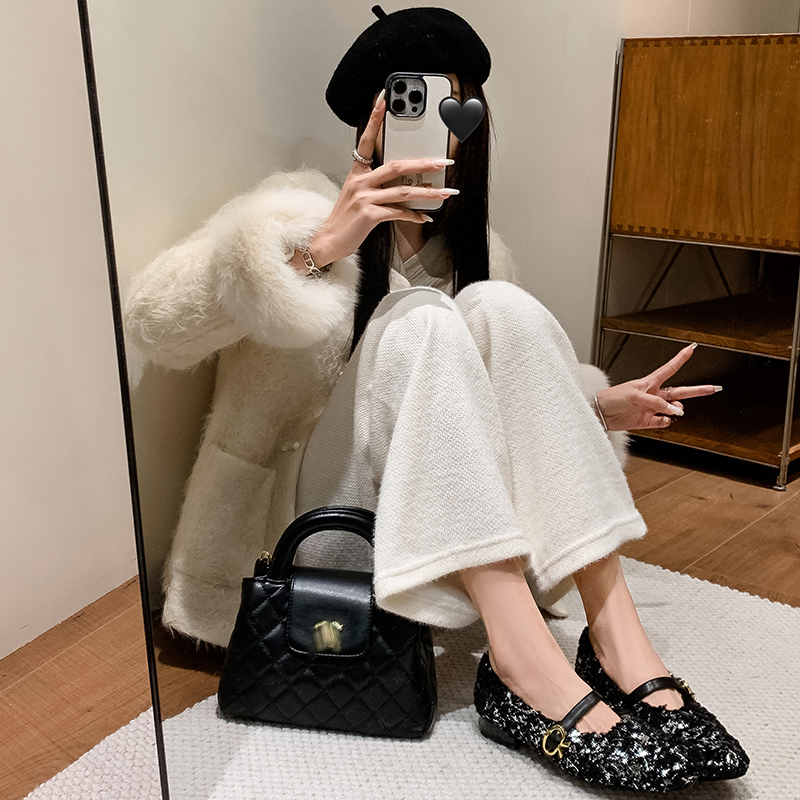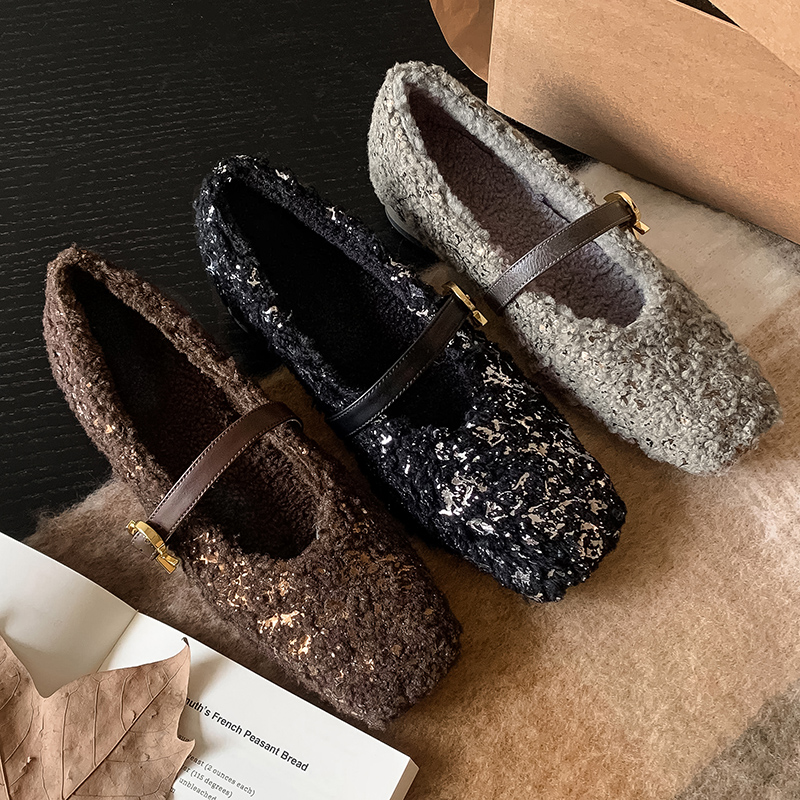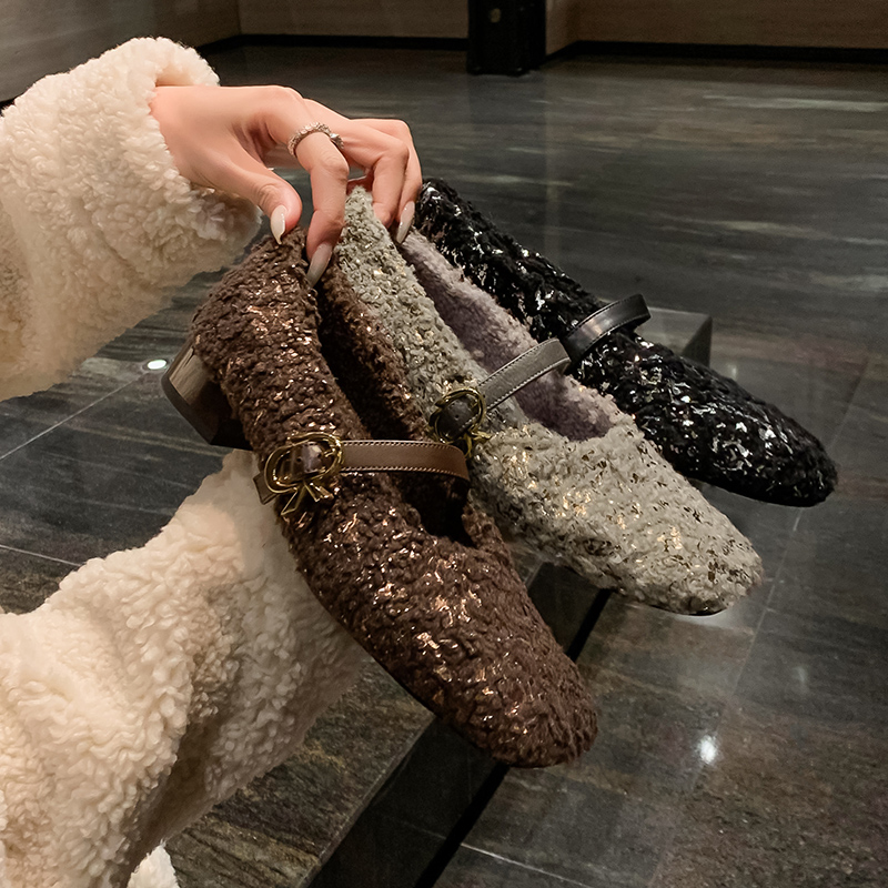 保暖羊羔毛加绒小个子毛毛棉鞋 新款 女2025春季 亮片玛丽珍粗跟单鞋
