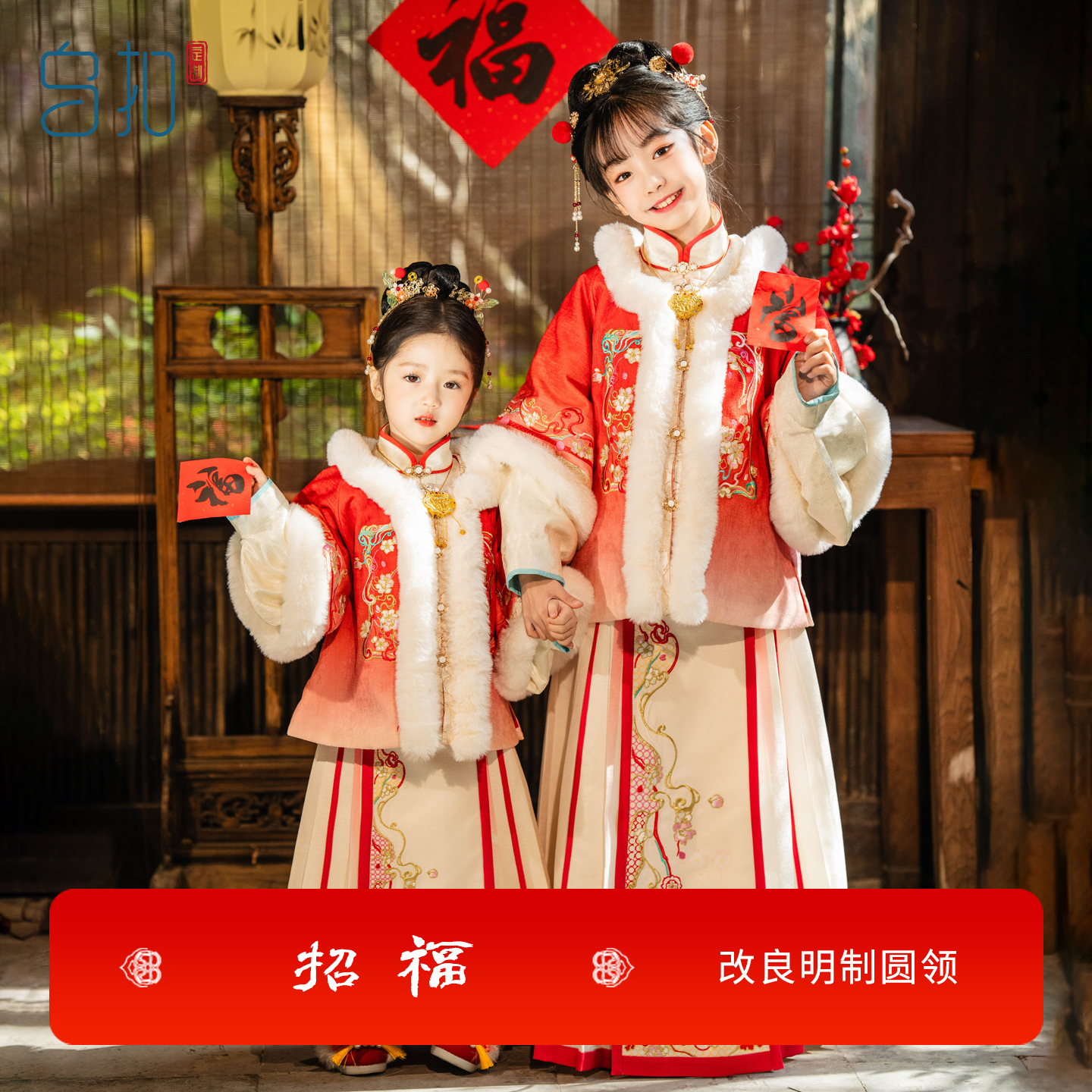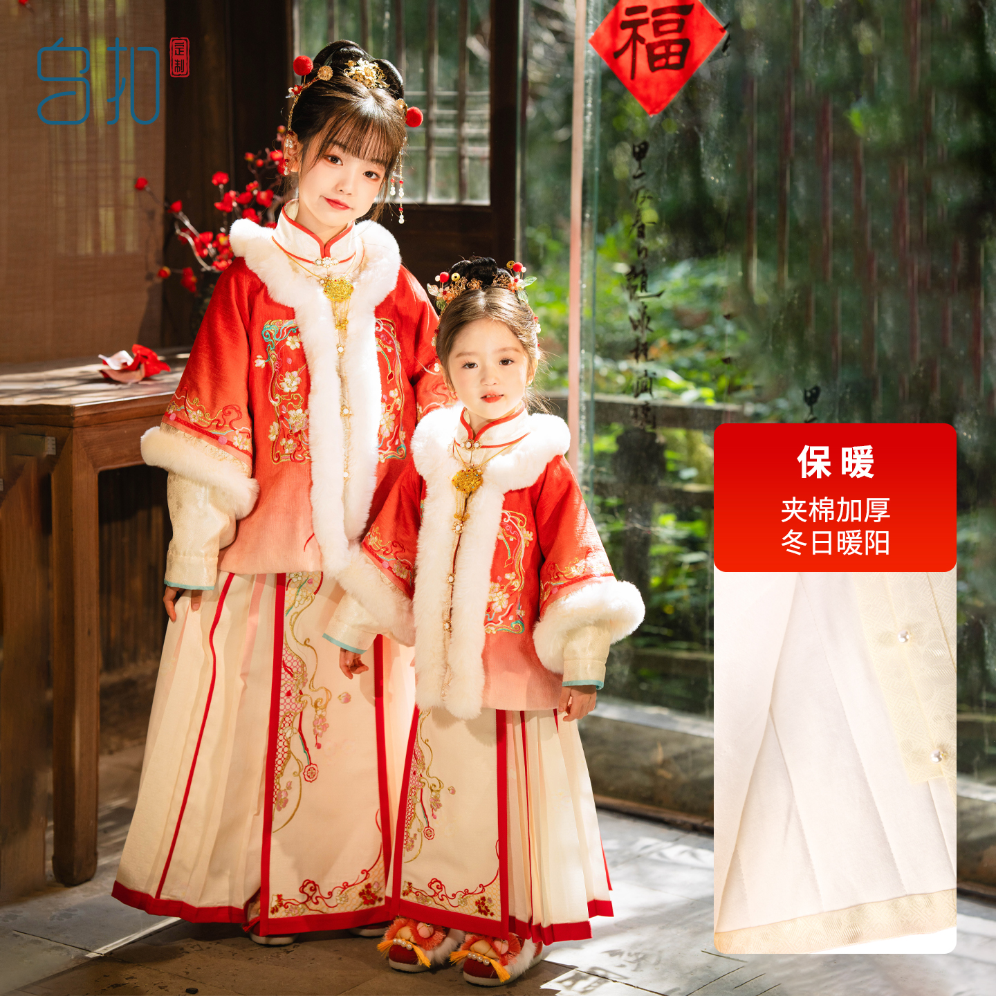 中国风新年加厚保暖明制套装 乌扣.招福 女童拜年服儿童汉服冬款
