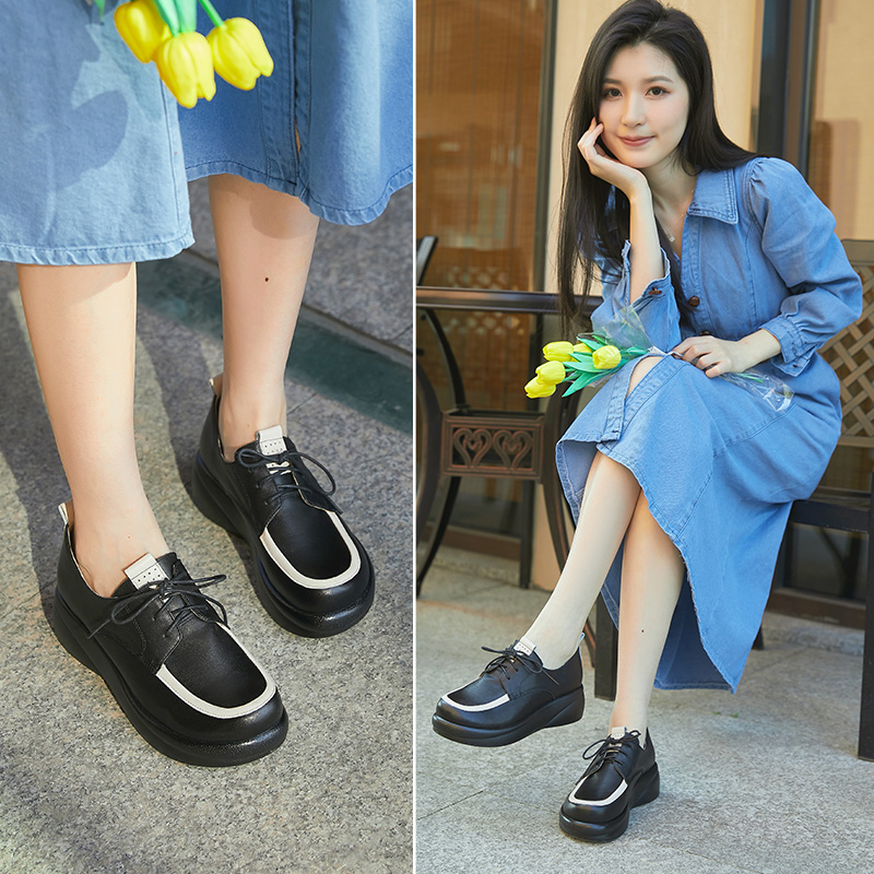 松糕底深口单鞋 真皮高跟系带圆头女鞋 厚底英伦小皮鞋 新款 2025春季