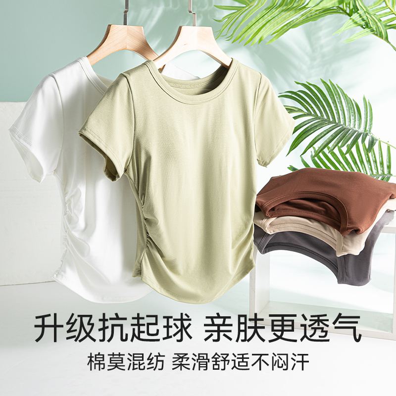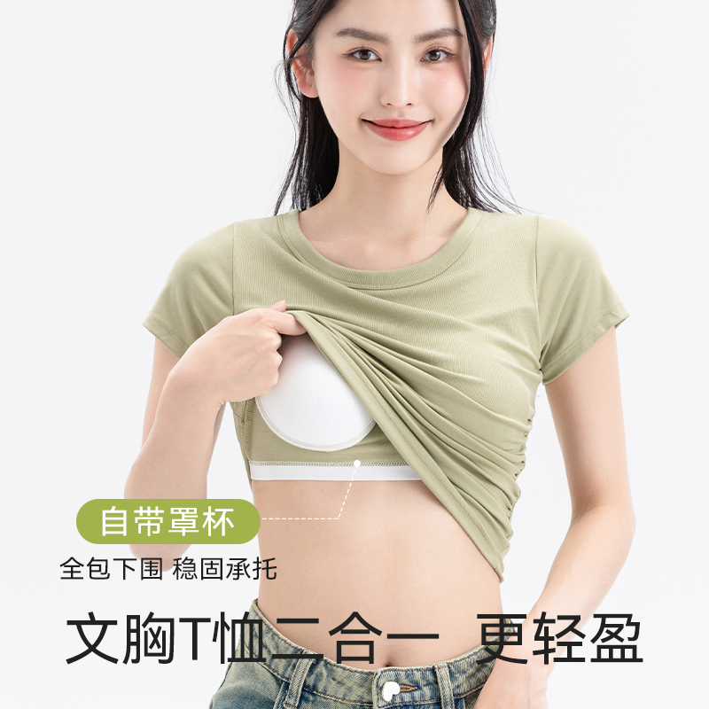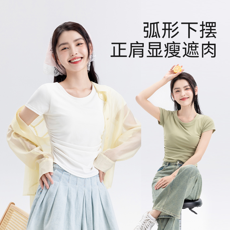 正肩甜辣妹气质小众设计感显瘦上衣 半袖 短袖 t恤女带胸垫夏打底衫