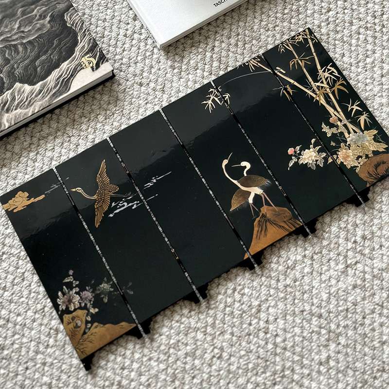 桌面漆器屏风小众软装 原创现代中古风中式 摆件 竹石仙鹤