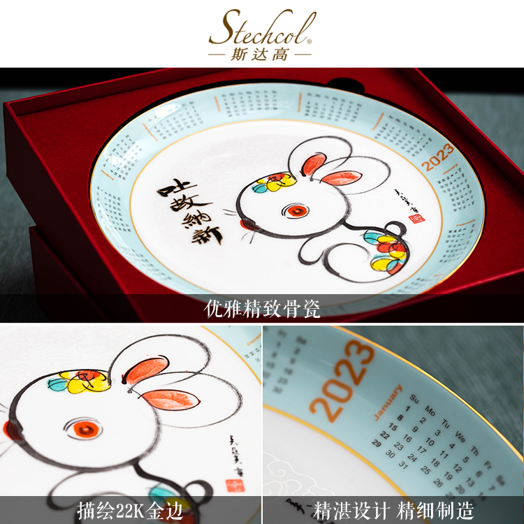 斯达高Stechcol 新春挂盘陶瓷饰品客厅创意摆件 兔故纳新中式