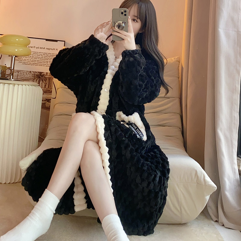 大码 春秋开衫 女士家居服 加厚珊瑚绒睡衣女冬法兰绒加绒套装 秋冬季