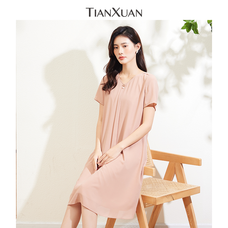 连衣裙名媛气质新款 女士粉红V领短袖 雪纺THXD093 夏季 天轩商场同款