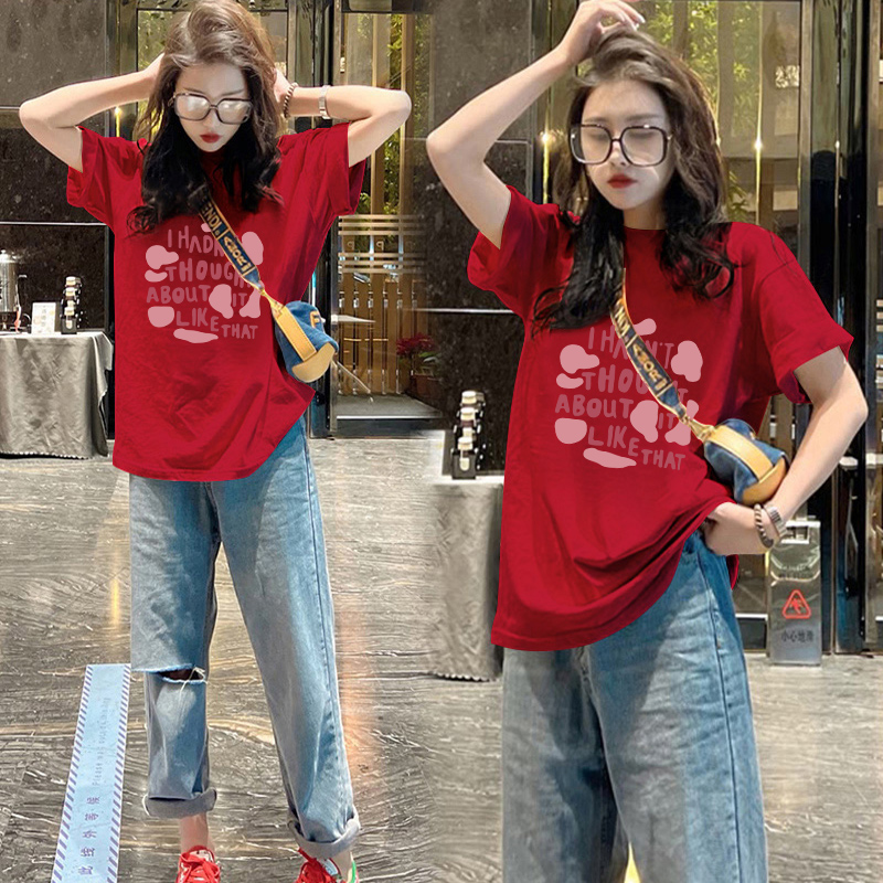 女装 复古大码 夏日多巴胺穿搭上衣 t恤女圆领纯棉宽松美式 粉色短袖