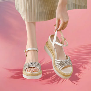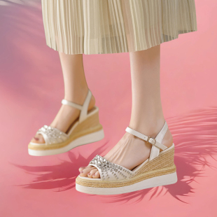 厚底一字带高跟小众编织坡跟鞋 新款 女2025夏季 度假风水钻鱼嘴凉鞋
