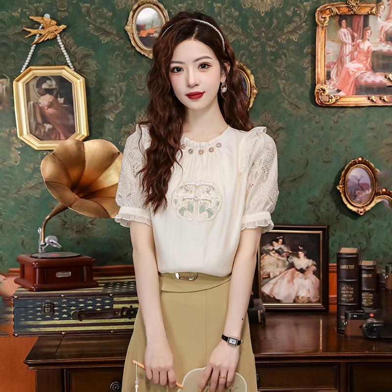 雪纺衫 国风绣花钉珠短袖 刺绣镂空圆领泡泡袖 新款 女 2024夏季 新中式