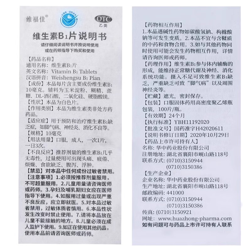 维福佳维生素b1片otc100片正品 官方旗舰营养神经Vb1治神经炎儿童