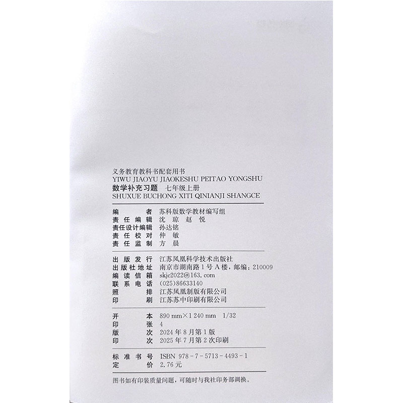 初一上下学期 社7年级上下册苏科版 2025年秋2025年春新版 补充习题数学七年级上下册江苏凤凰科学技术出版