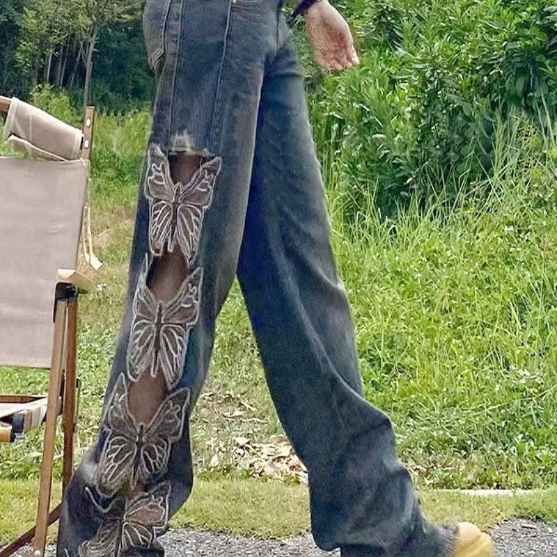 女25秋季 WANG红标双腰搭片牛仔裤 LEDIM 印花阔腿长裤 明星同款