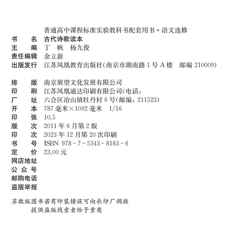 高中教科书配套用书 高中教辅 高中生用书 2024年 社 古代诗歌读本 江苏凤凰教育出版 语文读本