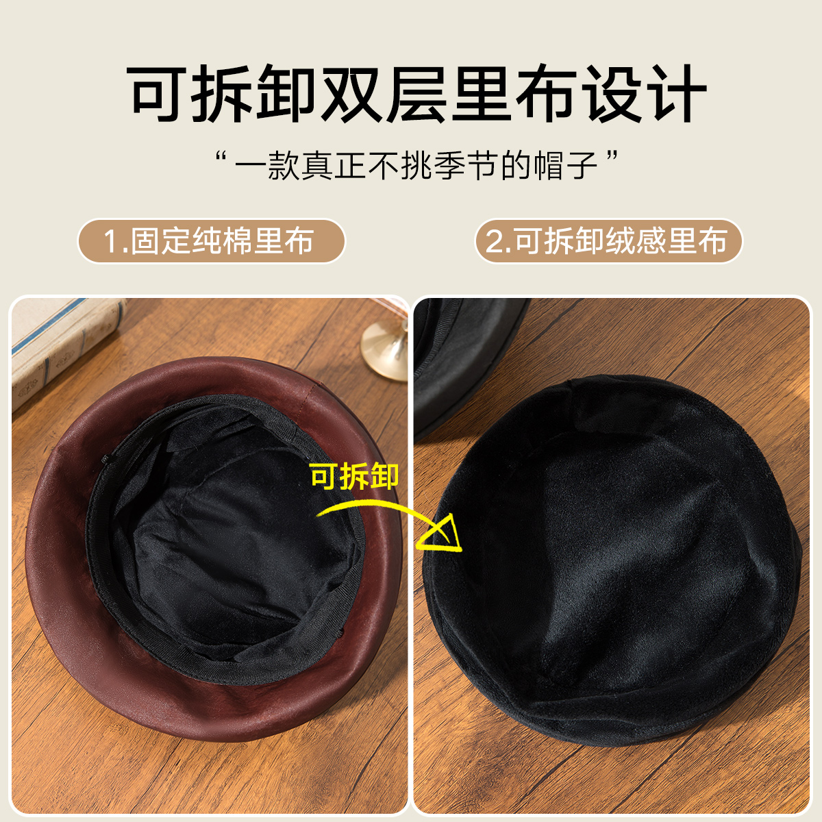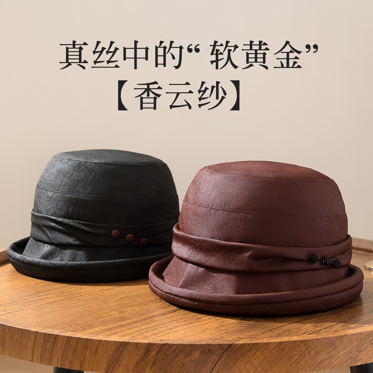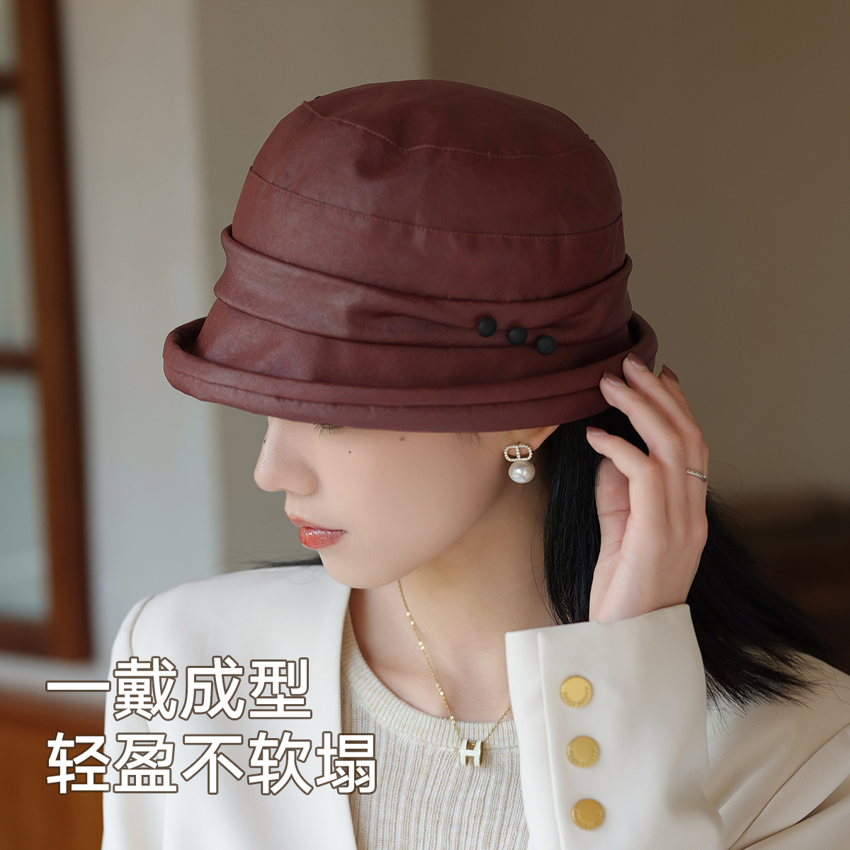 宏达 香云纱保暖盆帽秋冬女士高级感显脸小渔夫帽 可拆加绒内里