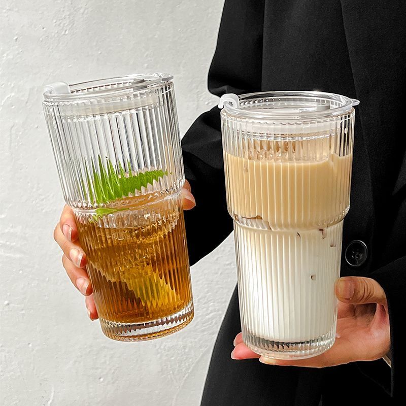 ins风大容量带盖带吸管竖条纹玻璃杯高颜值冷饮杯果汁咖啡杯水杯