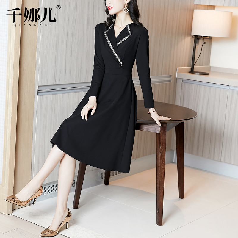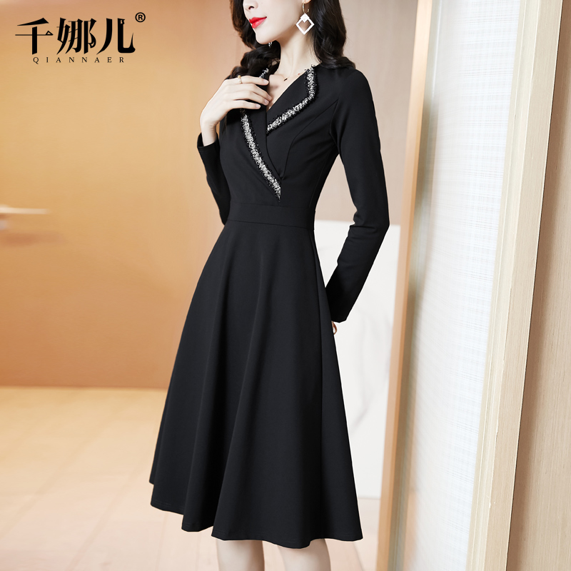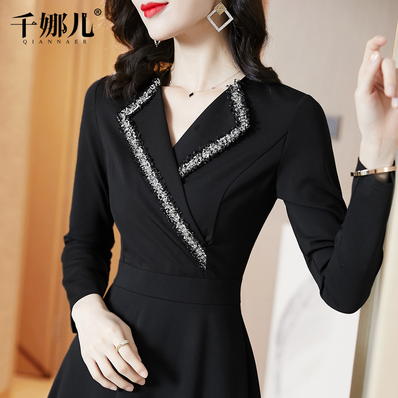 新款 裙女2025年秋季 钉珠木耳边显瘦连衣裙子 衬衫 预售黑色纯棉长袖