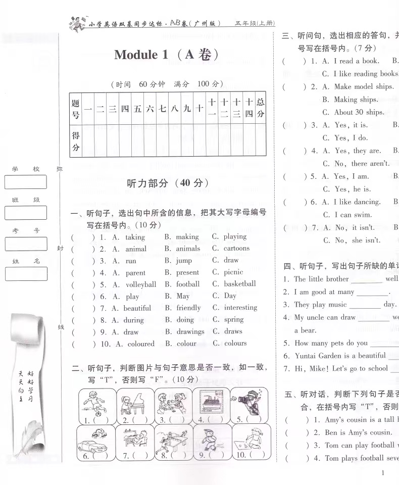 广州版 听力 小学英语双基同步达标AB卷 扫码 小学生5年级上学期英语同步练习期中期末测试英语辅导 5五年级上下册 新版