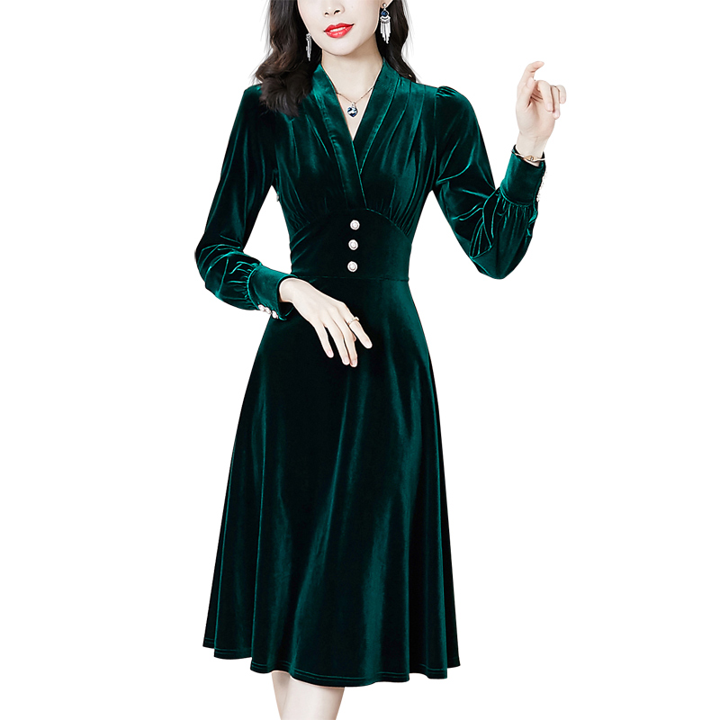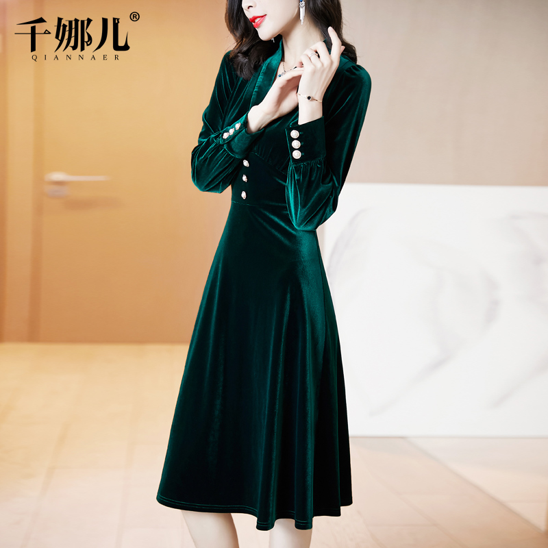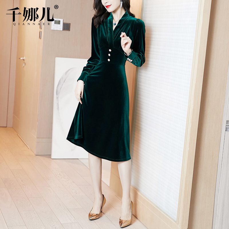 新年红色v领收腰连衣裙女冬装 蝴蝶结打底a字裙子 小香风圣诞裙法式