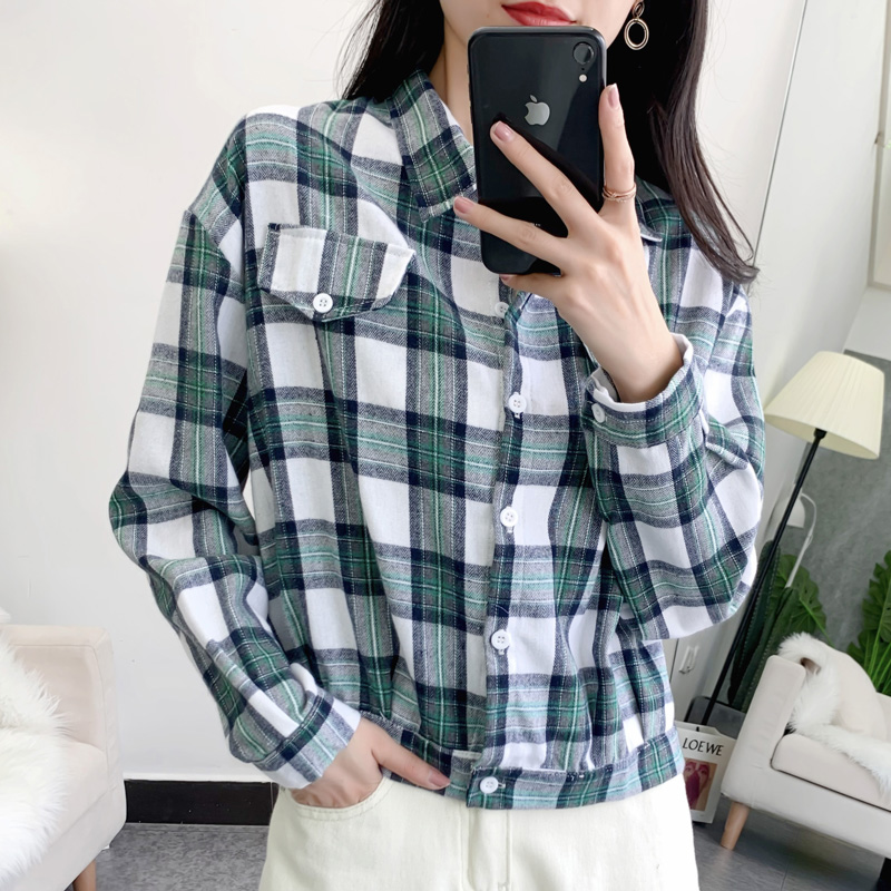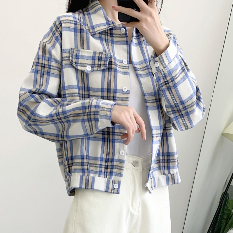 学生外穿短款 女长袖 上衣外套女 设计感小众格子磨毛衬衫 2024春秋款