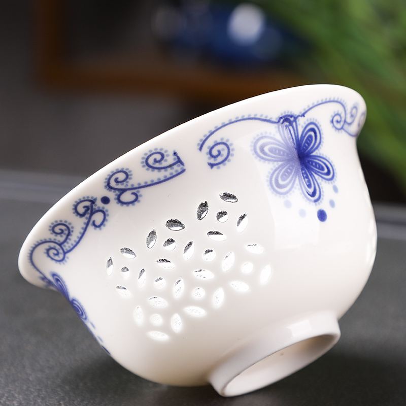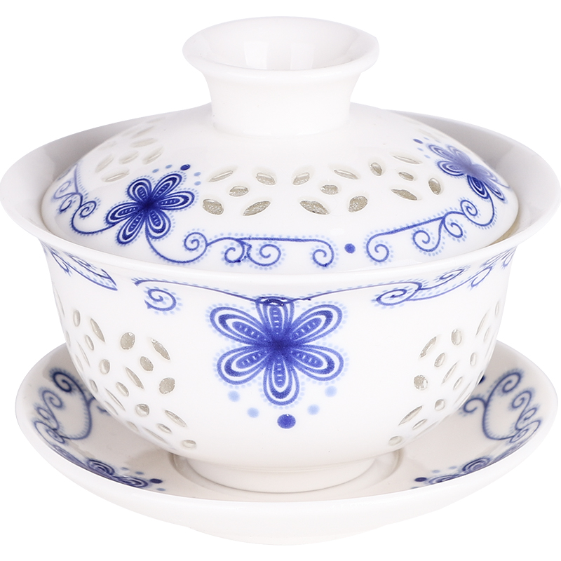 玲珑镂空茶具青花三才盖碗茶杯单个不烫手泡茶碗三泡台陶瓷沏茶碗
