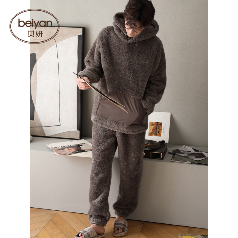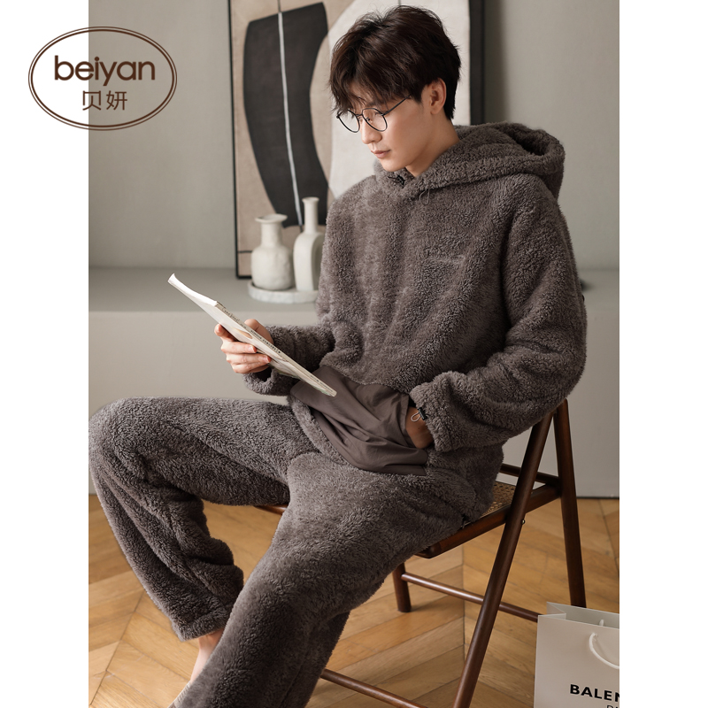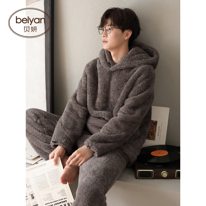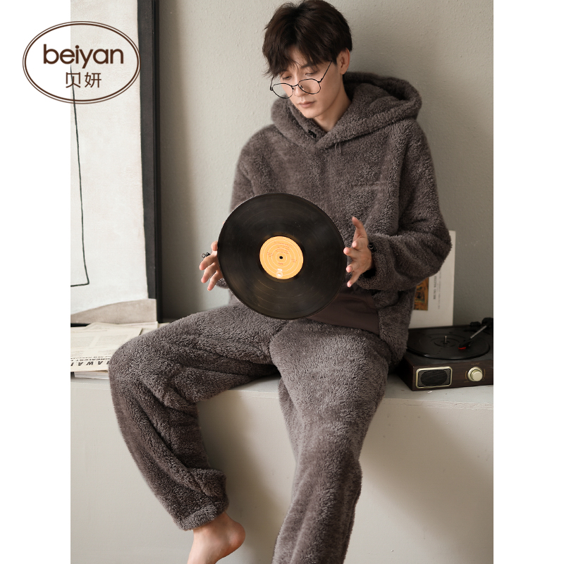 加绒连帽睡衣 青年大码 贝妍男士 秋冬珊瑚绒家居服加厚保暖运动套装