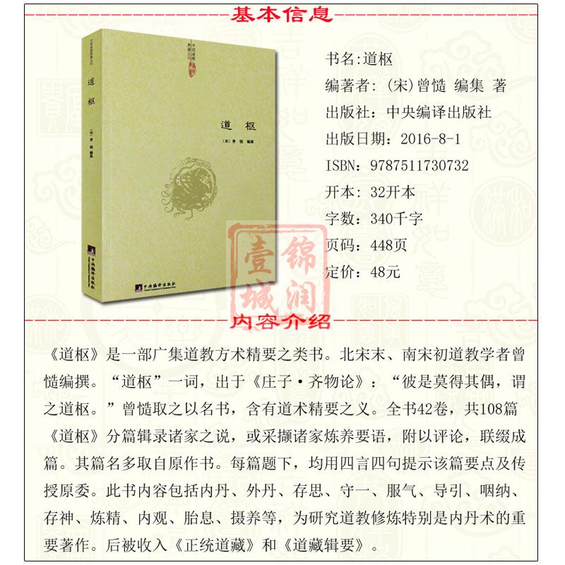 铅汞五行 阴符 服气 太极 道枢 大丹 金碧龙虎 参同契 大还金丹 黄庭 胎息 呼吸 灵宝等 入药镜 炼精 全书42卷共108篇举凡道教哲学