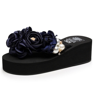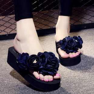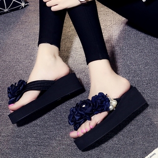 甜美花朵沙滩鞋 外穿时尚 防滑坡跟夹脚人字拖韩版 女夏季 厚底凉拖鞋