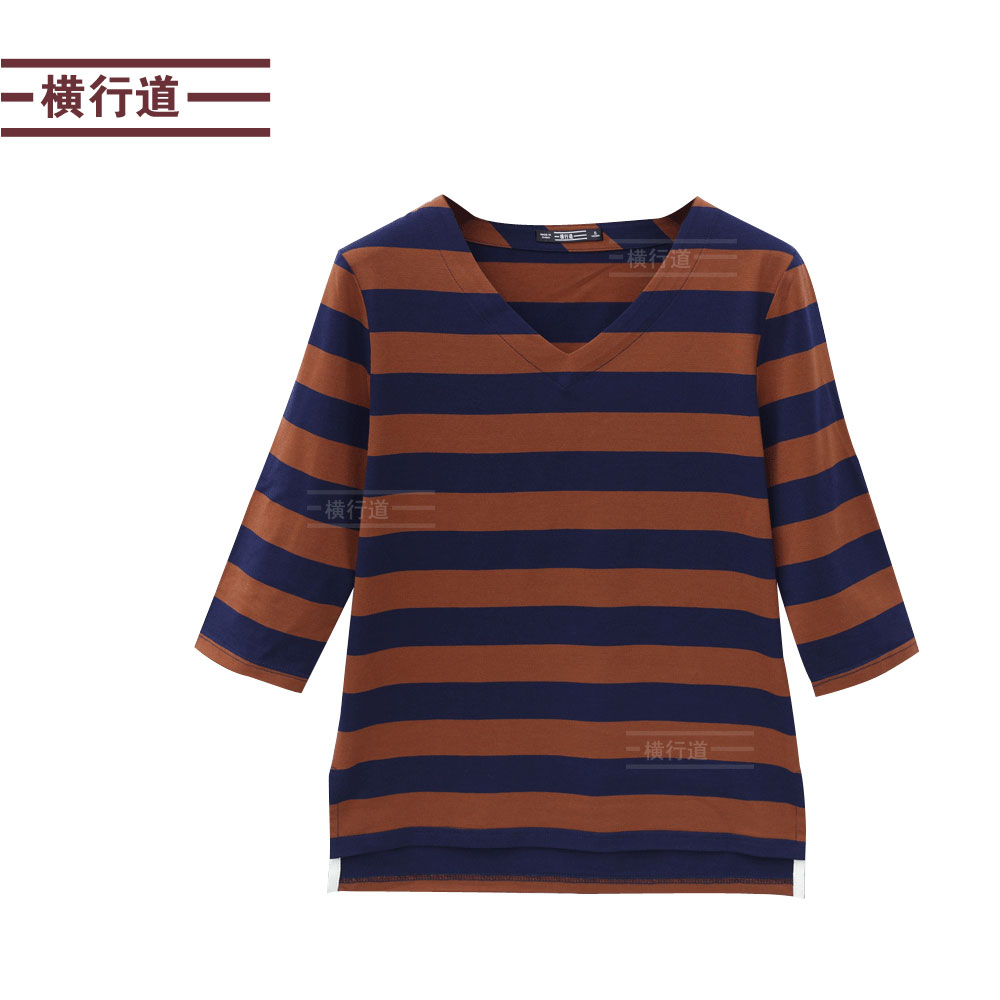 女外穿七分袖 2025秋季 v领打底衫 t恤女装 上衣 条纹胖MM中年妈妈中袖