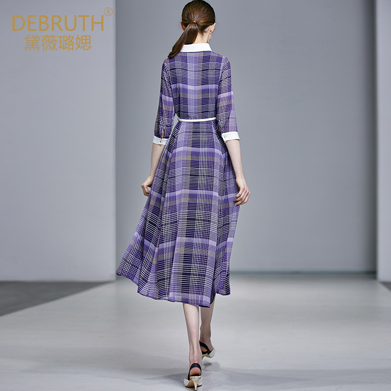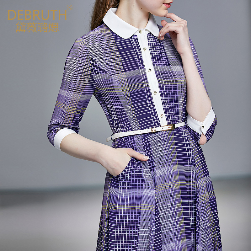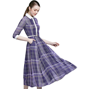 A裙 气质收腰七分袖 黛薇璐媤娃娃领格子雪纺连衣裙女春秋新款 法式