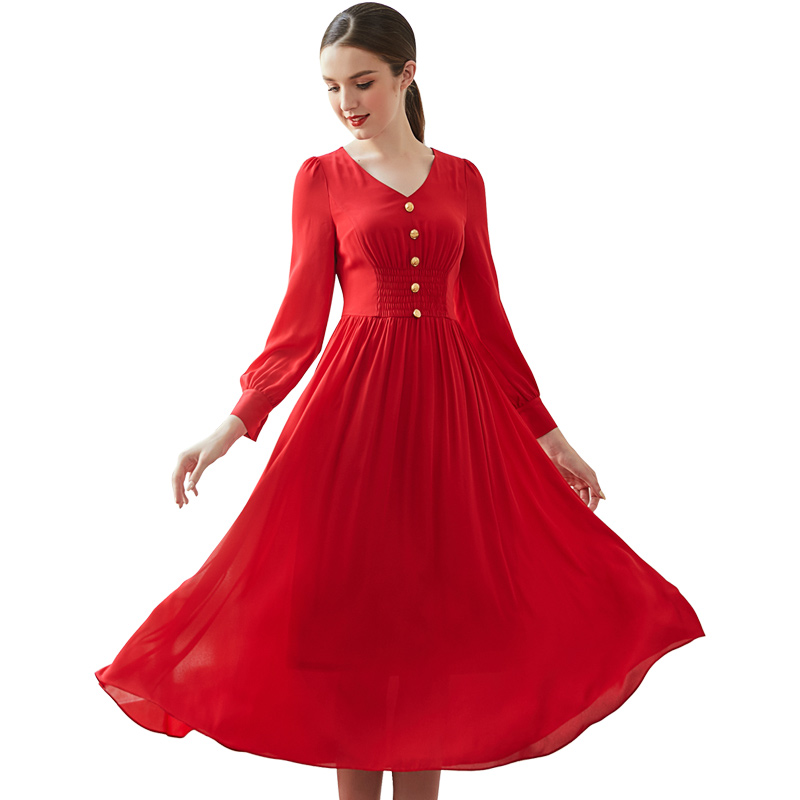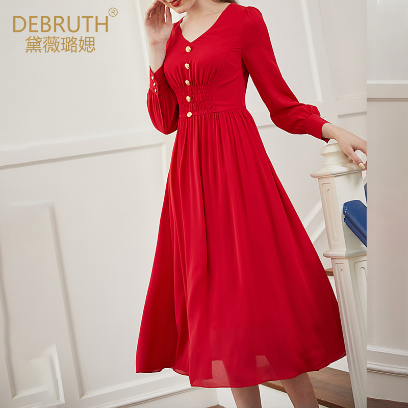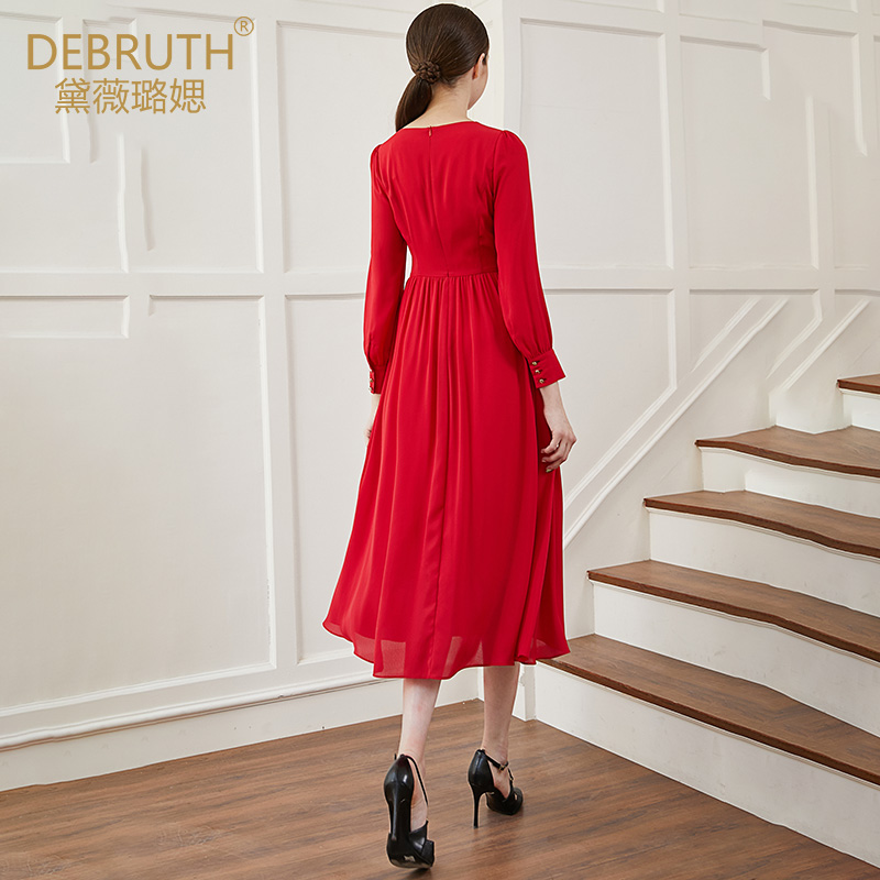 菲梦伊原创钉珠红色连衣裙女秋装 复古高贵金丝绒收腰礼服长裙 新款