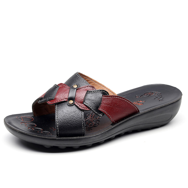 女夏拖鞋 外穿平底软底厚底百搭防滑真牛皮中老年妈妈奶奶凉拖